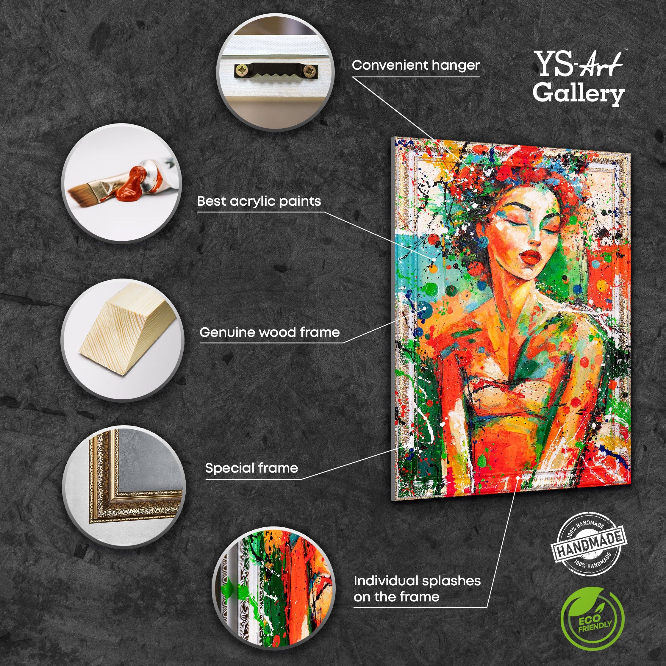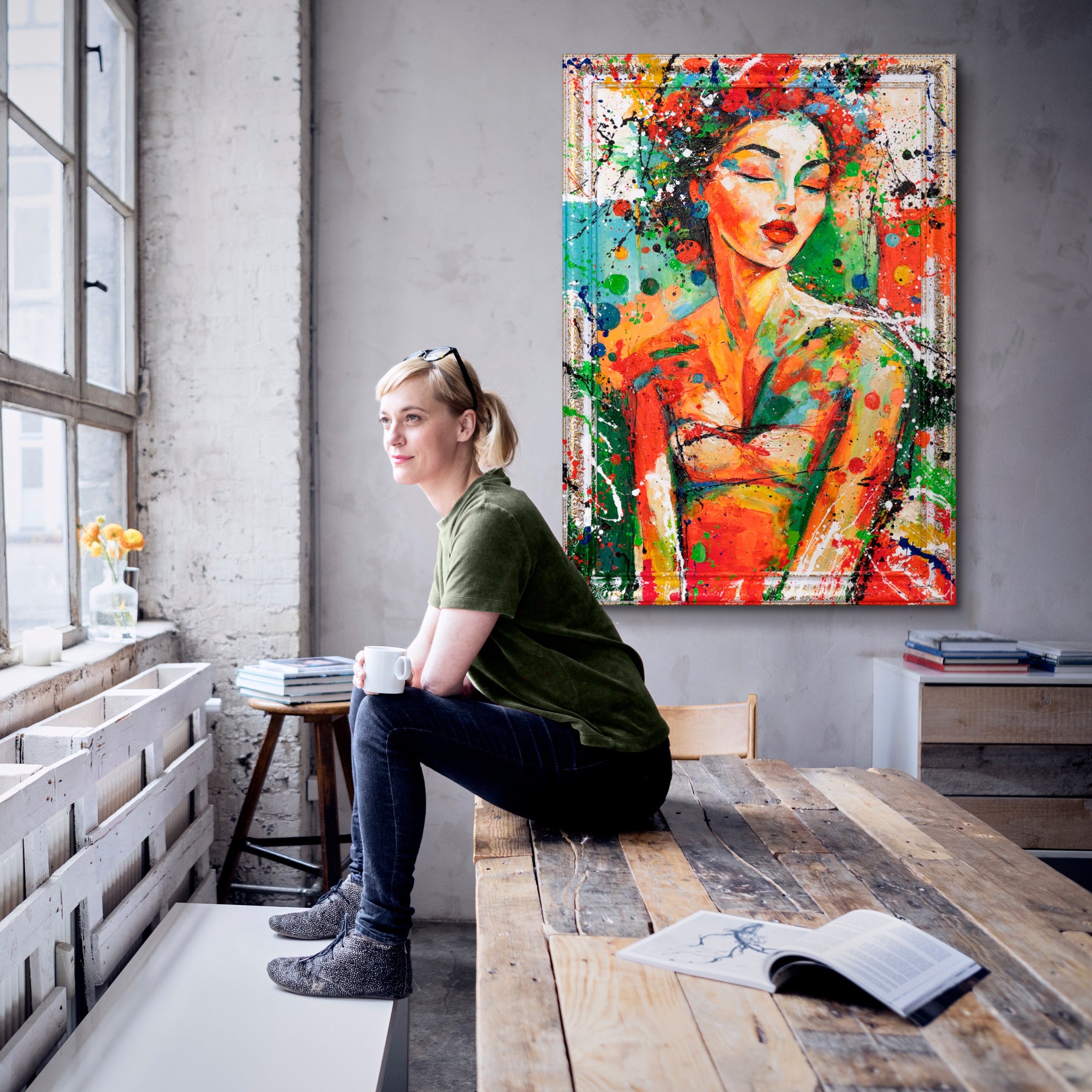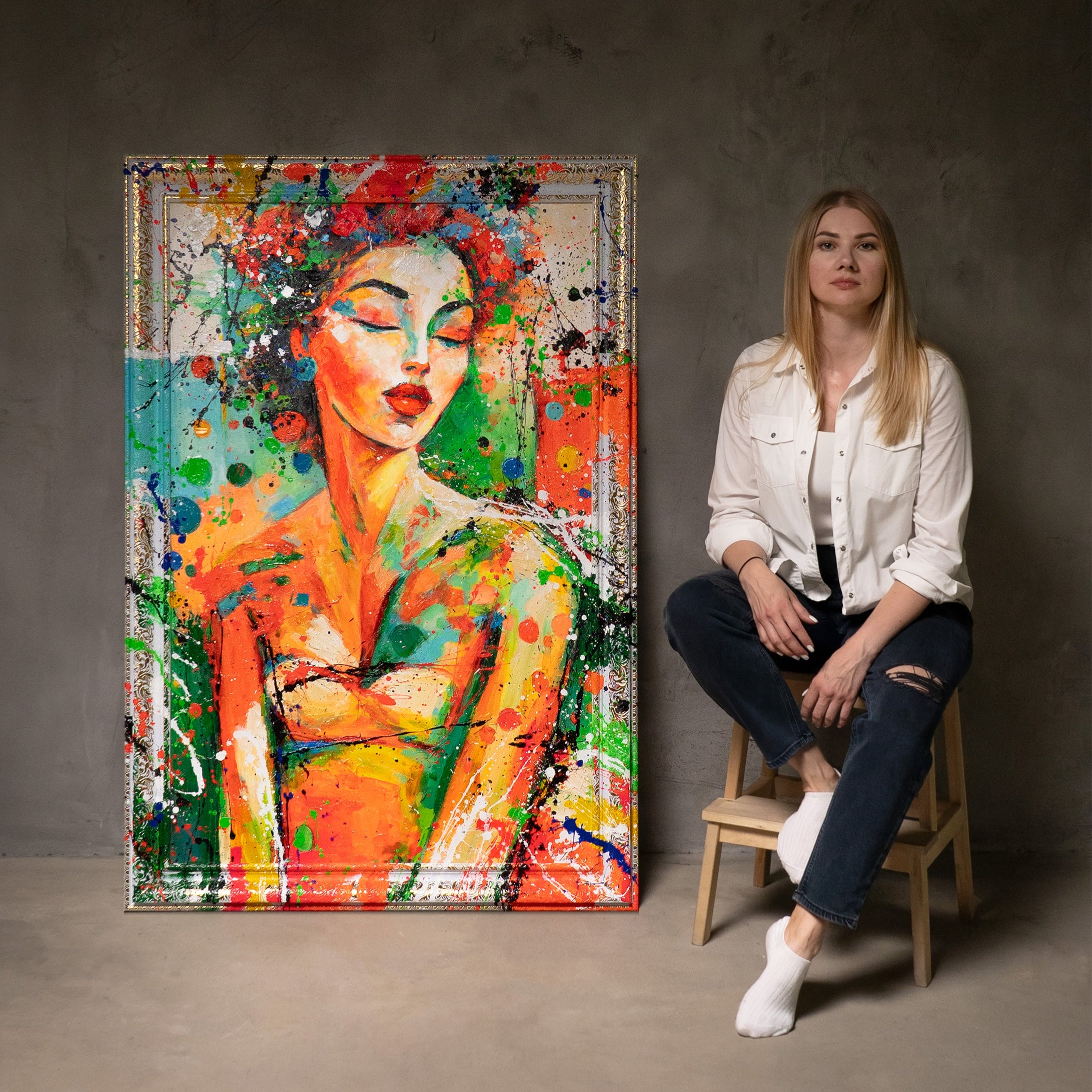 „Kleur van haar Dromen“ is een stralend vrouwenportret vol emoties en artistieke expressie. De gesloten ogen en harmonieuze gelaatstrekken smelten samen met een zee van levendige kleuren die lijken te spatten als dromen op het canvas. Elke penseelstreek is handgeschilderd en geeft het werk een unieke textuur en diepte.