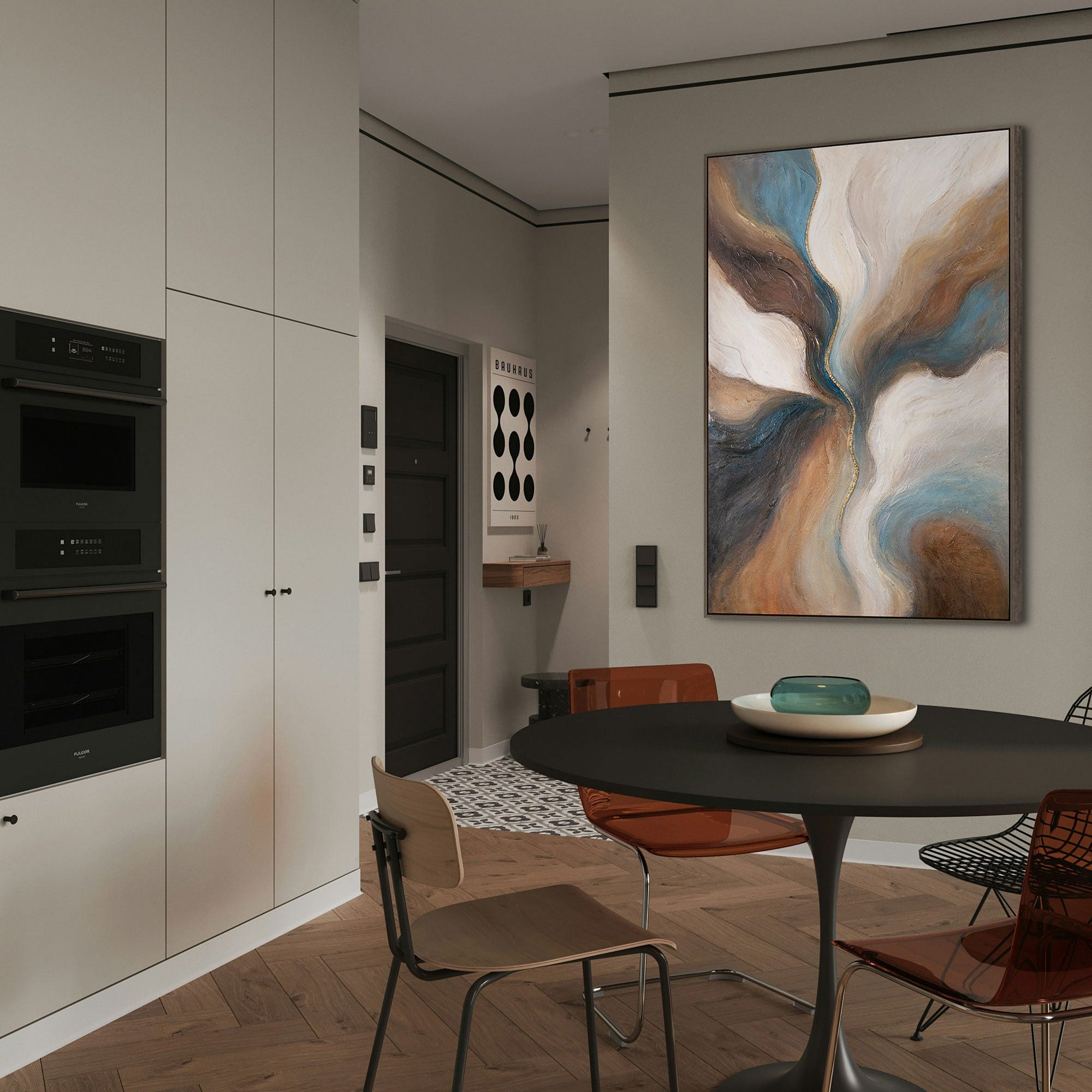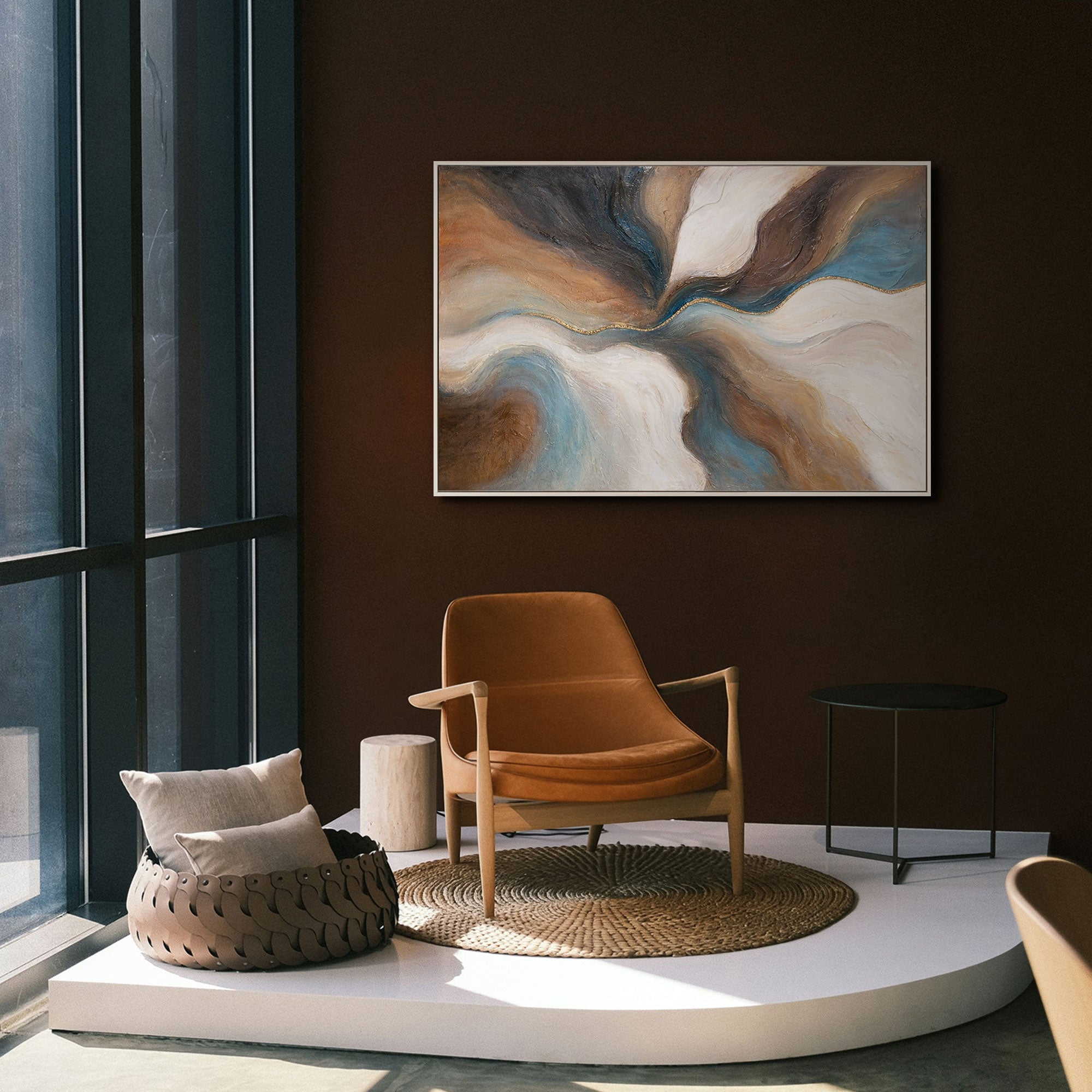 Dit abstracte kunstwerk past perfect bij moderne, minimalistische en elegante woonstijlen. Het geeft de woonkamer, slaapkamer of kantoor een bijzondere uitstraling en creëert een sfeer van rust en tegelijkertijd krachtige energie.