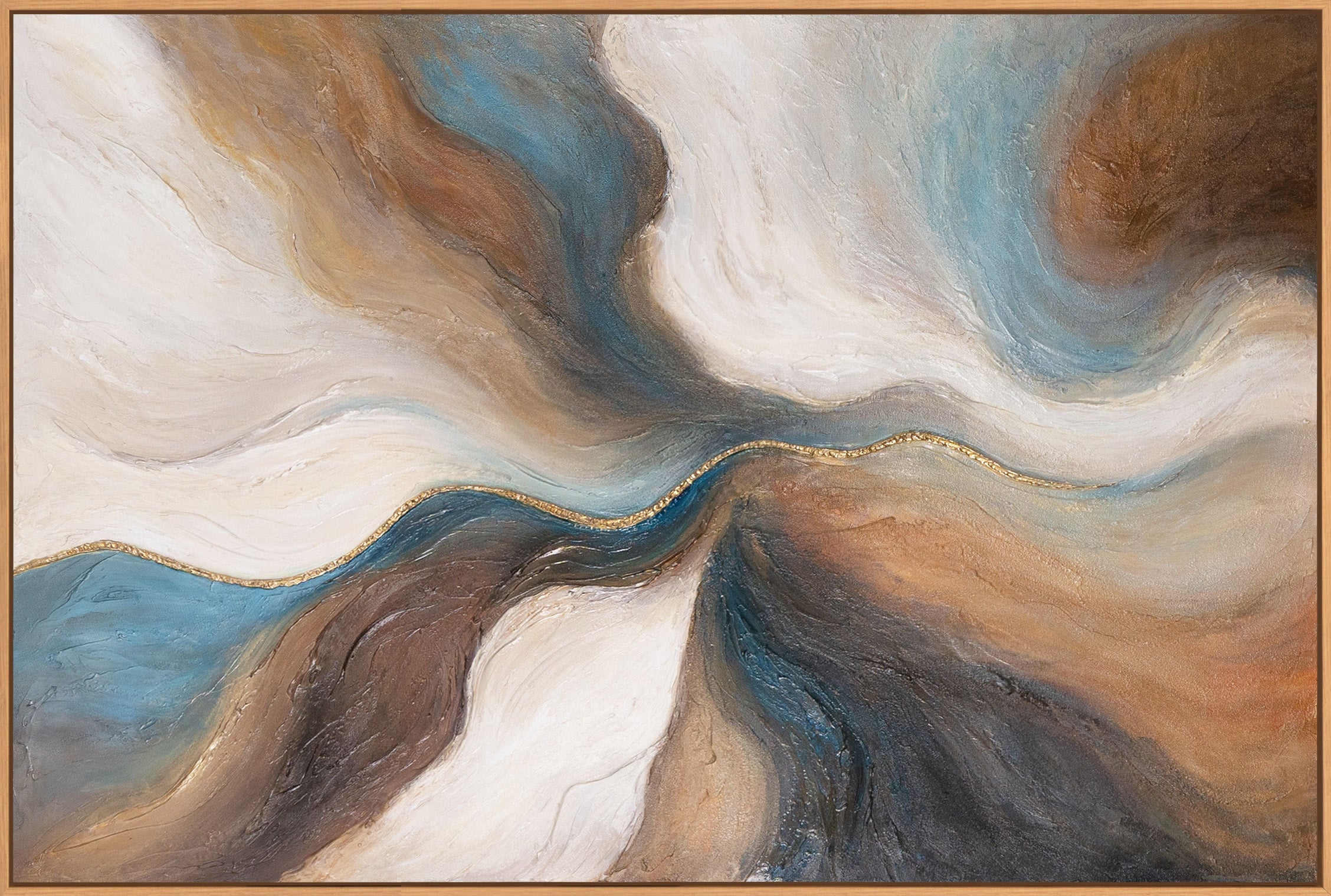 "Passage of Time" toont een vloeiend samenspel van warme aardetinten, delicate crèmekleurige vlakken en koele blauwe accenten. De organische bewegingen roepen beelden op van golven, sedimenten of landschappen die in de loop der tijd veranderen. Een fijne gouden lijn loopt door het schilderij en verleent het werk elegantie en subtiele verfijning. De impasto-textuur geeft het oppervlak een levendige uitstraling en voegt diepte toe aan elke ruimte.