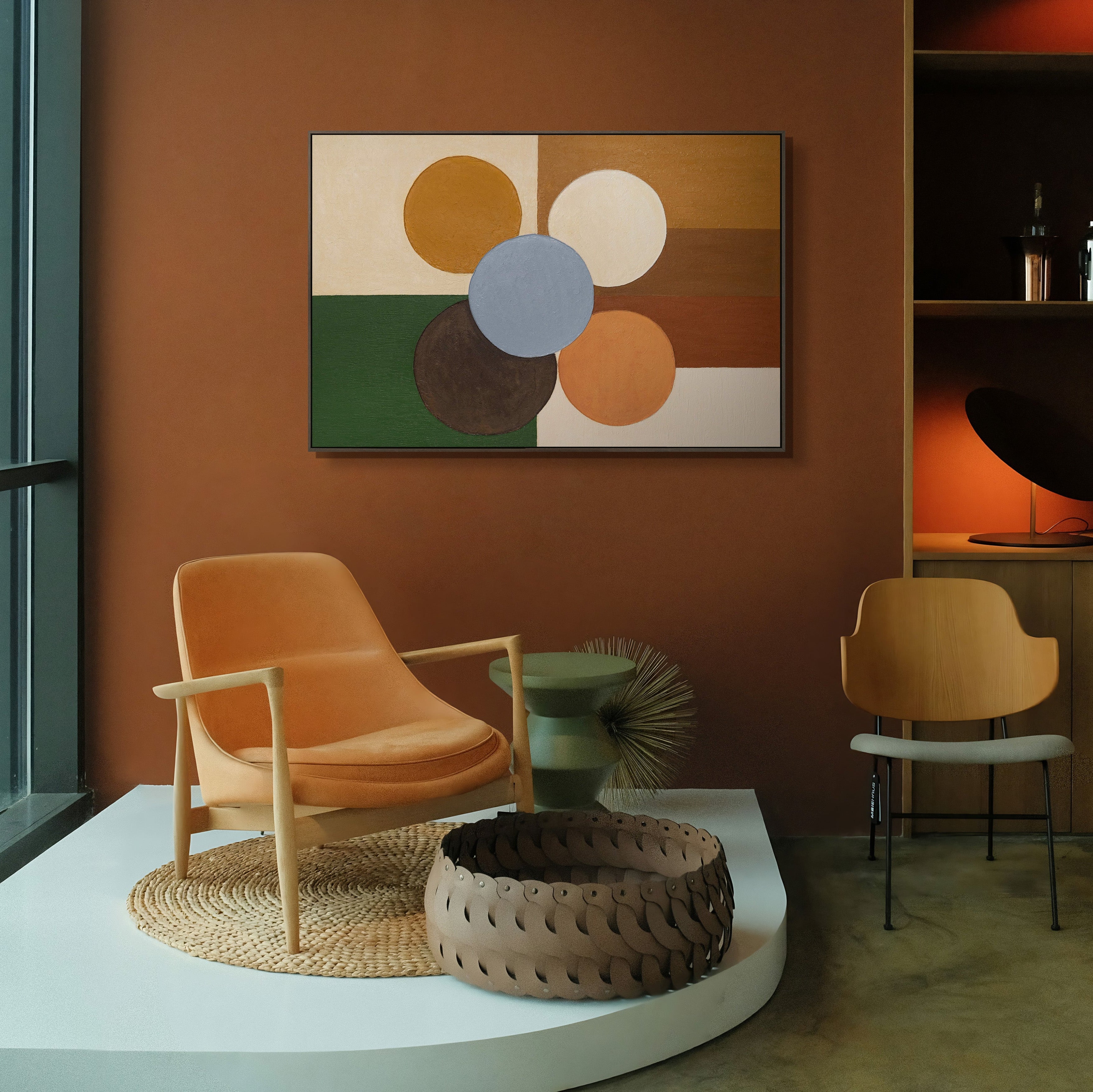 „Sphäre der Balance“ ist eine moderne abstrakte Acrylmalerei mit klaren Kreisformen und ruhiger geometrischer Struktur. Die ausgewogene Komposition aus Beige Ocker Grün Blau und warmen Naturfarben erzeugt eine harmonische Flächenwirkung und vermittelt Stabilität sowie visuelle Ruhe.