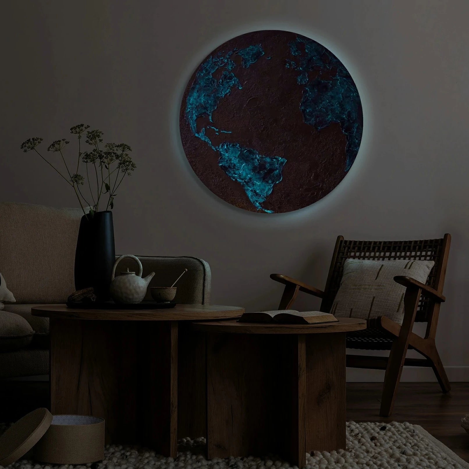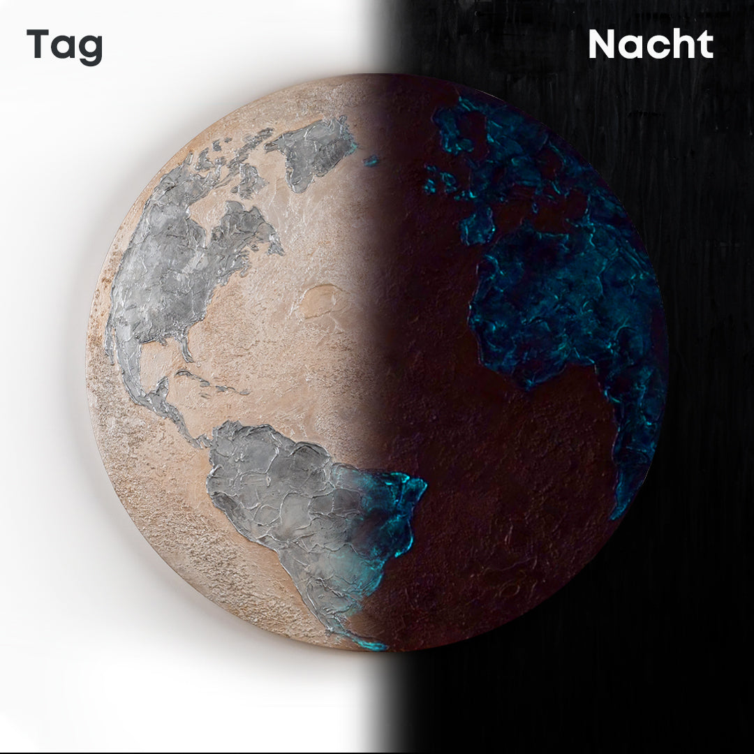 Overdag straalt dit structuurschilderij rust en elegantie uit dankzij het harmonieuze kleurenschema en de tastbare texturen. Zodra het donker wordt, verandert het in een zachte, warme lichtbron dankzij hoogwaardige fluorescerende verf – perfect voor wie zijn interieur zowel overdag als 's avonds wil verrijken met een stijlvol kunstwerk dat ook als natuurlijke nachtlamp fungeert.