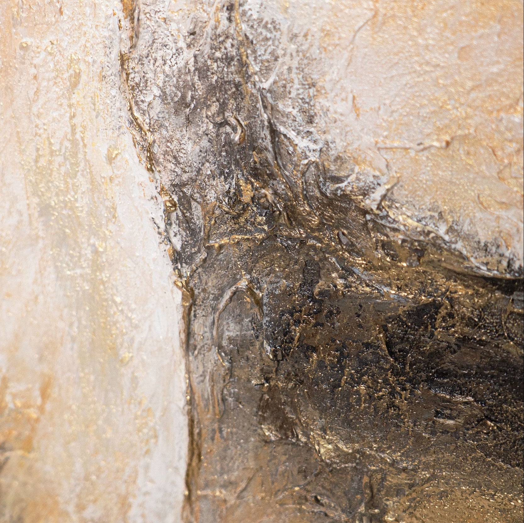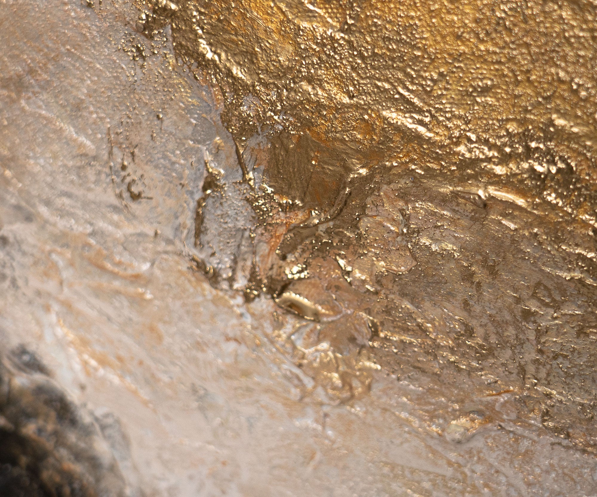 Elk doek is met de hand geschilderd op natuurlijk canvas en voorzien van een rijke reliëfstructuur met bladgoudaccenten.