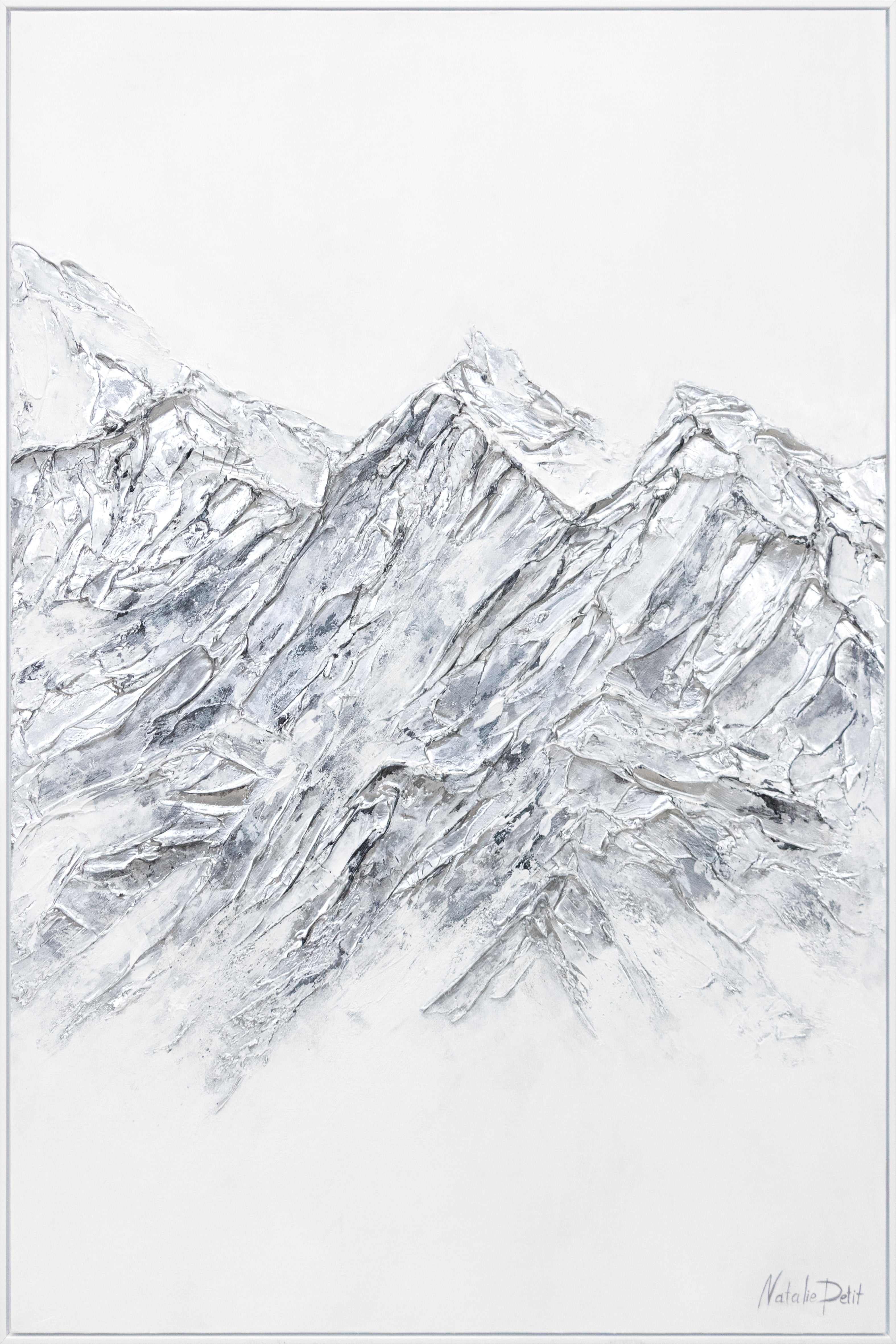 Die abstrakte Darstellung der „Zugspitze II“ fasziniert durch ihre reduzierte Farbgebung in Weiß-, Grau- und Silbertönen. Durch den gezielten Einsatz von Strukturpaste entsteht eine dreidimensionale Oberfläche, die die majestätische Präsenz der Alpen in moderner Form interpretiert. Die harmonische Komposition vermittelt Ruhe, Klarheit und Kraft – ideal für minimalistische Interieurs und lichtdurchflutete Räume.
