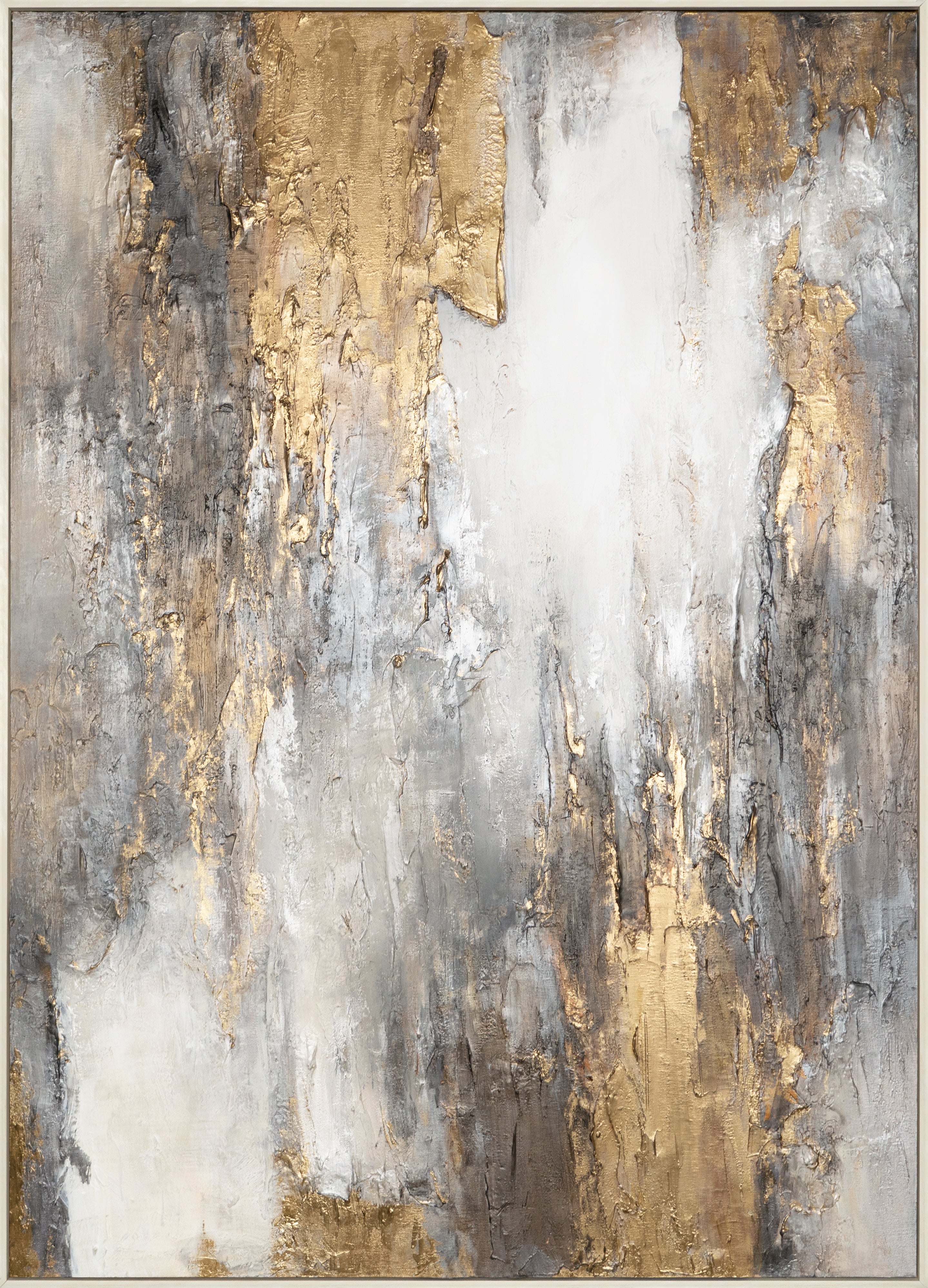 "Zachte tijdstroom" is een krachtig abstract schilderij dat indruk maakt met subtiele grijs- en crèmetinten, verrijkt met opvallende goudaccenten.